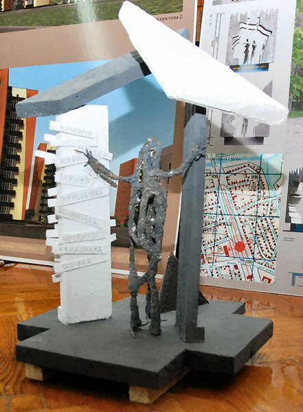 A monument is represented as the Ukrainian peasant's hut with a three-skate roof. Ot these are two walls - black and white and fragments of roof. On one of sthenes of house are the names of settlements in which most people perished during golodomora, - Korovincy, Mikhaylovka, Shpilevka et al. Between sthenes is a symbolic silhouette of woman. Behind a peasant's hut is a low pyramid with the carved dates «32-33» - as character of eternity and memory lost during golodomora.